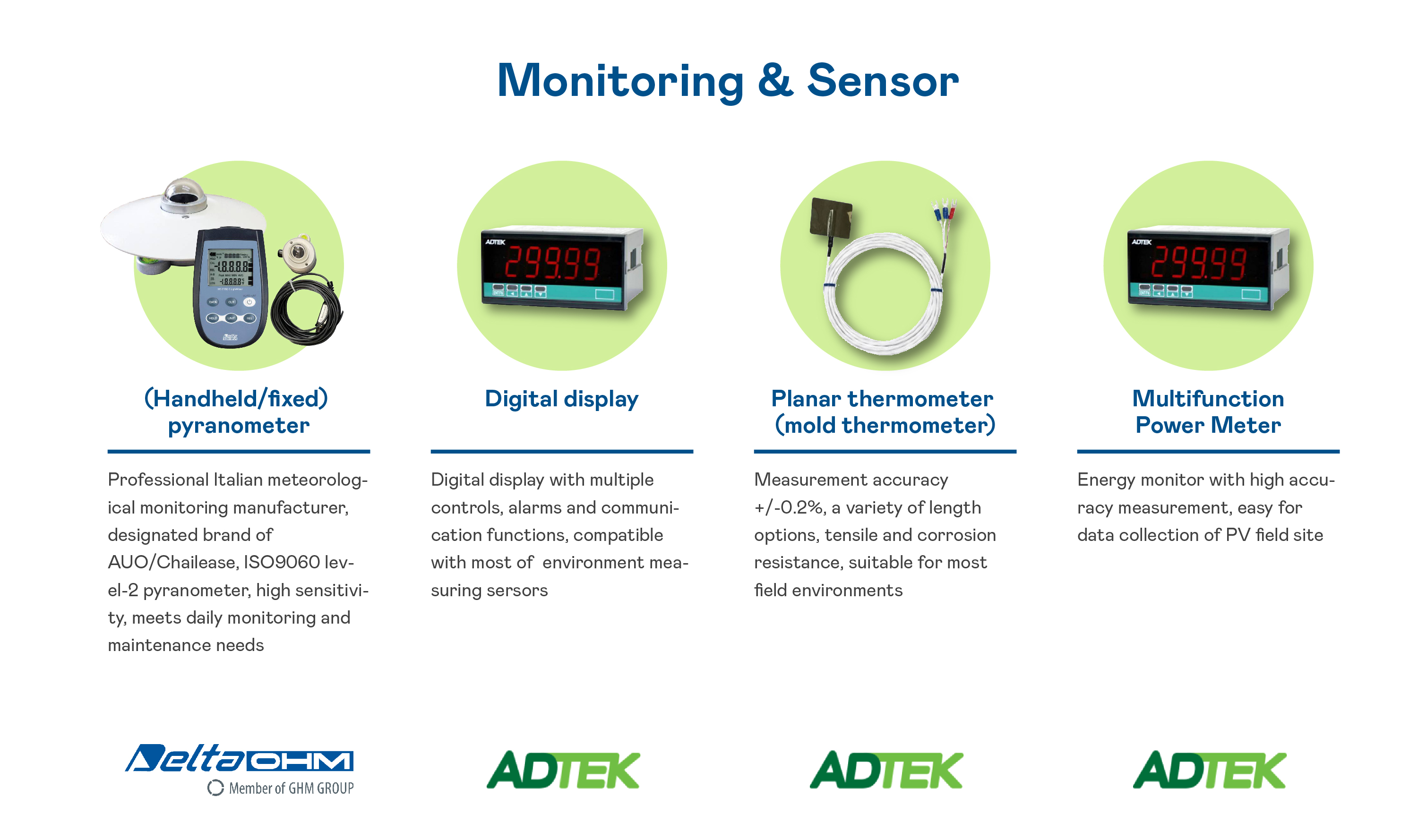 With its "one-stop shopping" service, AUO not only possesses its own solar modules, monitoring, software and hardware integration solutions, it also provides other reliable, high-quality components and products for the solar power plants of customers, including important components, such as converters, connectors, wires and cables, and component products, such as environmental monitoring devices, related auxiliary materials and tools.